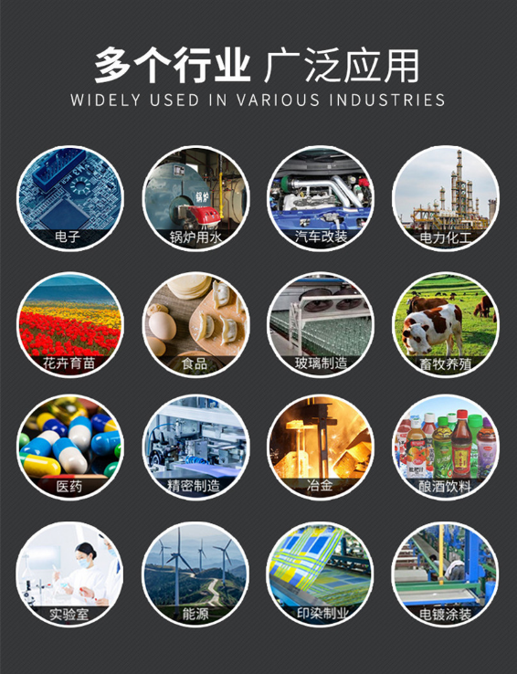 5.制取電鍍工藝用去離子水;電池(蓄電池)生產(chǎn)工藝的純水;汽車、家用電器、建材產(chǎn)品表面涂裝、清洗沌水;鍍膜玻璃用純水;紡織印染工藝所需的除硬除鹽水。